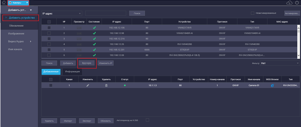 Разберем на примере регистратора 1NR04120-P и камерой 1NCD4069:Зайдите в web интерфейс регистратора - "Настройка" - "Добавить" и нажмите кнопку "Вручную".