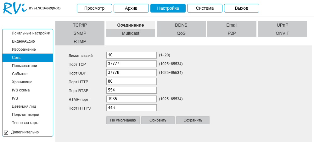 * - Посмотреть, какой у вас выставлен TCP порт на камере можно в web интерфейсе камеры в настройках сети - вкладка "Соединение".