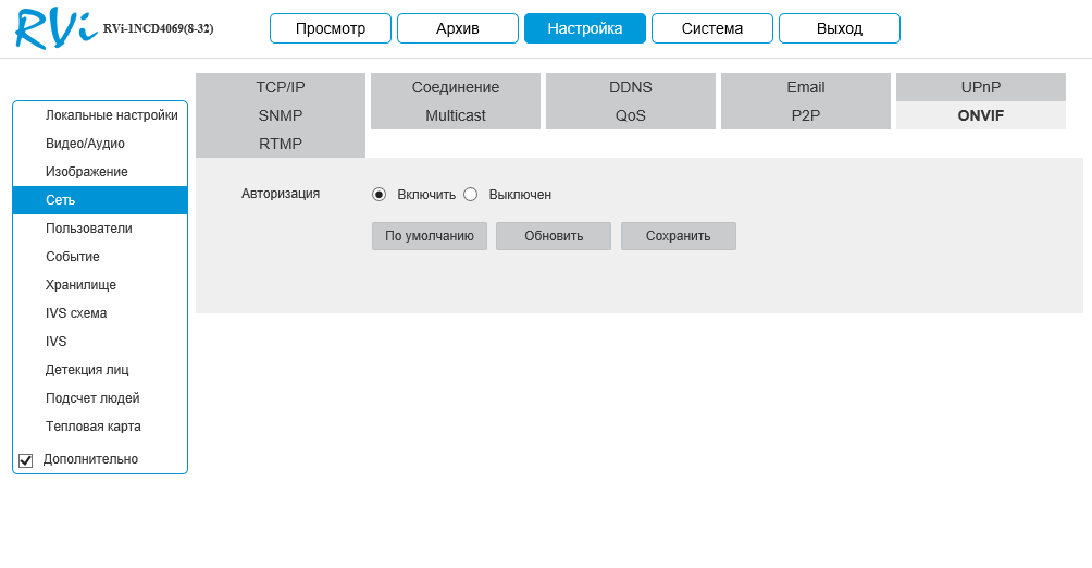 2. При добавлении по протоколу Onvif. Порядок действий аналогичный описанному выше. Меняется только производитель на "Onvif" и порт. По умолчанию порт у протокола Onvif - 80. Посмотреть включен Onvif на камере можно так же в web интерфейсе камеры в настройках сети.