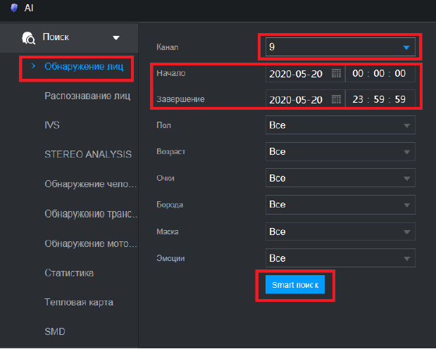 Затем выберите «Обнаружение лиц», укажите нужный канал, время начала и время завершения. Нажмите «Smart поиск»