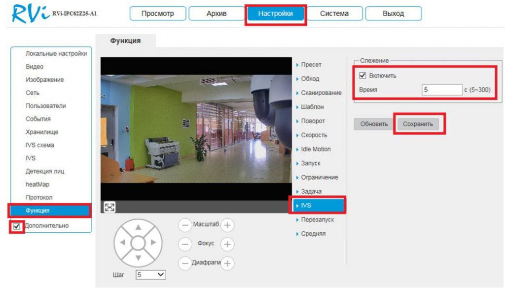 4.1 Для включения данной функции, перейдите в меню «Настройки», далее галка «Дополнительно, затем выберите пункт «Функция», далее «IVS». В данном окне отметьте галку «Включить» и задайте время слежения в секундах. Сохраните изменения кнопкой «Сохранить».